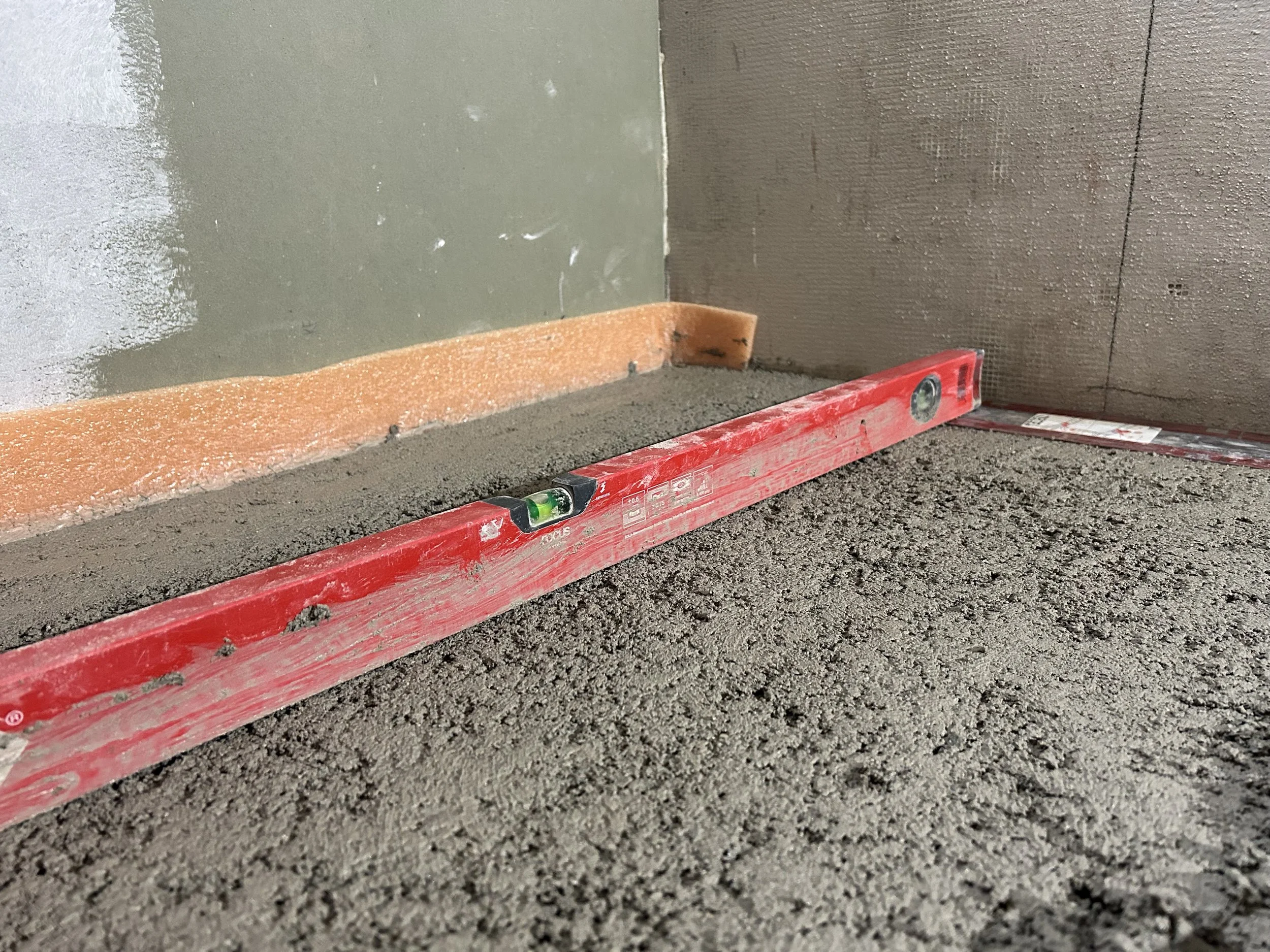 Vorbereitung und Einbau von Estrich als Grundlage für die Fliesenverlegung.